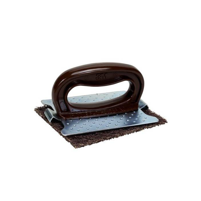 Grillipesin 3M, jossa ruskea muovinen kahvaosa ja metallinen levykiinnitys. Käytetään Scotch-Brite 82 grillin puhdistuslevyn kanssa.