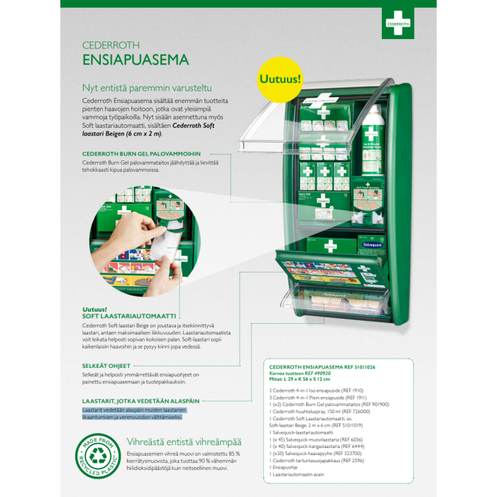 Cederroth Ensiapuasema sisältää enemmän tuotteita pienten haavojen hoitoon, jotka ovat yleisimpiä vammoja työpaikoilla. Nyt sisään asennettuna myös Soft laastariautomaatti, sisältäen Cederroth Soft laastari Beigen (6 cm x 2 m).