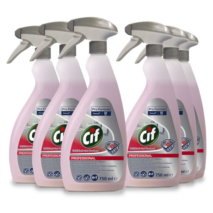 Cif Pro Formula 4in1 saniteettitilojen desinfioiva puhdistusaine puhdistaa ja desinfioi samanaikaisesti sekä poistaa saostumia ja pahaa hajua. Soveltuu kovien, vettä ja happamia aineita sietävien pintojen samanaikaseen puhdistamiseen ja desifiointiin.