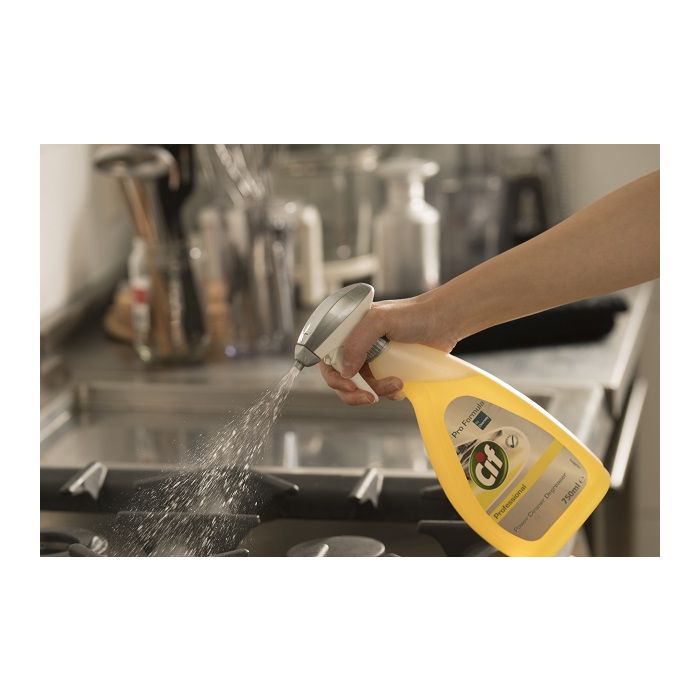 Cif Pro Formula tiivistetty rasvanpoistoaine liuottaa nopeasti rasvan ja pinttyneen lian jättäen kiiltävän puhtaan pinnan.