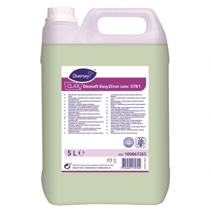 Clax Deosoft Easy2Iron conc on ammattimaiseen tekstiilien huoltoon kehitetty nestemäinen huuhteluaine. Se helpottaa silitystä huomattavasti, sekä neutraloi hajut jättäen tekstiileihin pitkäkestoisen tuoksun. Tuote sopii lähes kaikille tekstiilimateriaaleille ja sitä voidaan annostella käsin tai automaattisesti.