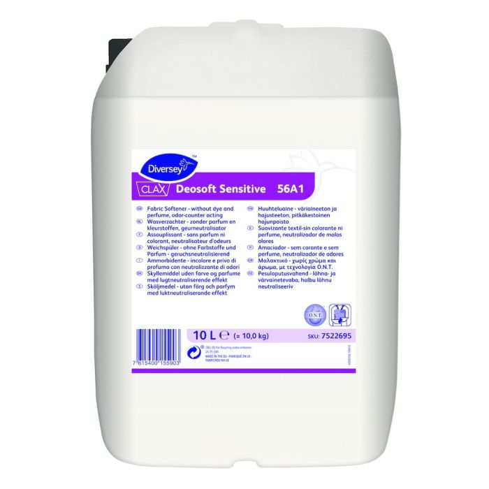 Clax Deosoft Sensitive on ammattimaiseen tekstiilihuoltoon kehitetty, neutraali, hajua poistava, nestemäinen tekstiilien huuhteluaine. Tuote sopii lähes kaikille tekstiilimateriaaleille ja sitä voidaan annostella käsin tai automaattisesti.