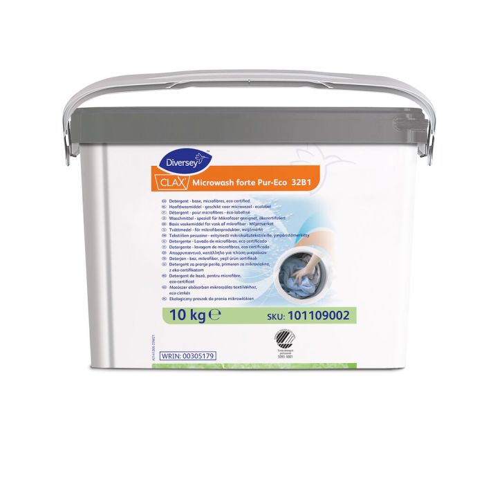 Clax Microwash Forte Pur-Eco 32B1 on jauhemainen pääpesuaine, joka sopii kaikentyyppisille pesuloille. Tuote on kehitetty erityisesti mikrokuitutekstiilien pesuun ja sitä voidaan käyttää laajalla lämpöalueella (30-90 ºC) kaikissa veden kovuuksissa. Clax Microwash soveltuu myös muiden kirjavien ja tummien tekstiilien yleispesuun. Koostumuksensa ansiosta se sopii myös pyykin esipesuun ja liotukseen.