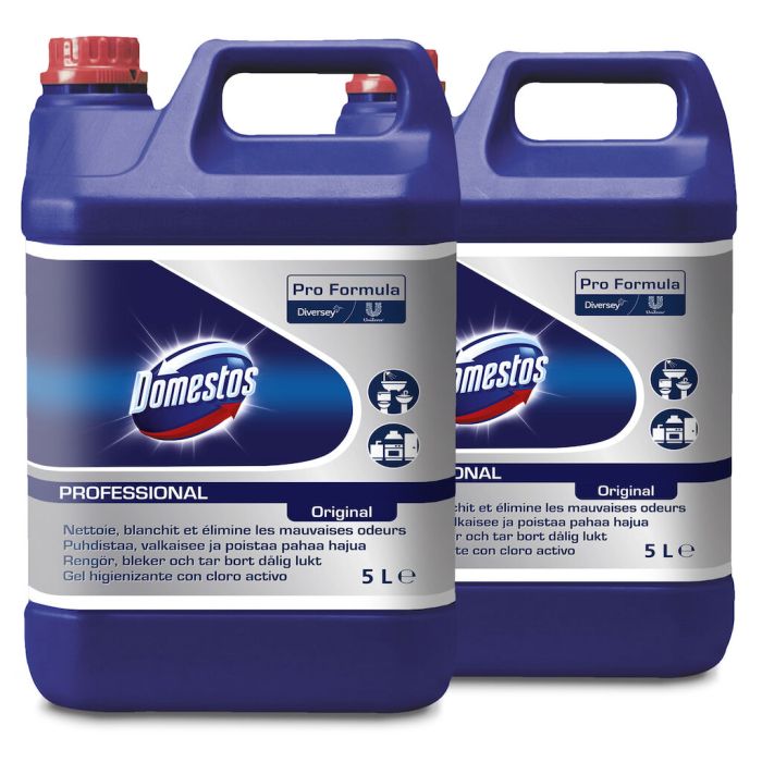 Domestos Professional Original puhdistaa ja desinfioi samanaikaisesti sekä tuhoaa mikrobeja WC:ssä, kylpy- ja suihkutiloissa ja saunoissa. Sopii myös jäteastioiden ja -säiliöiden sekä siivousvälineiden puhdistamiseen. Pakkaus: kannu, 5 litraa.