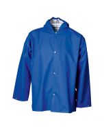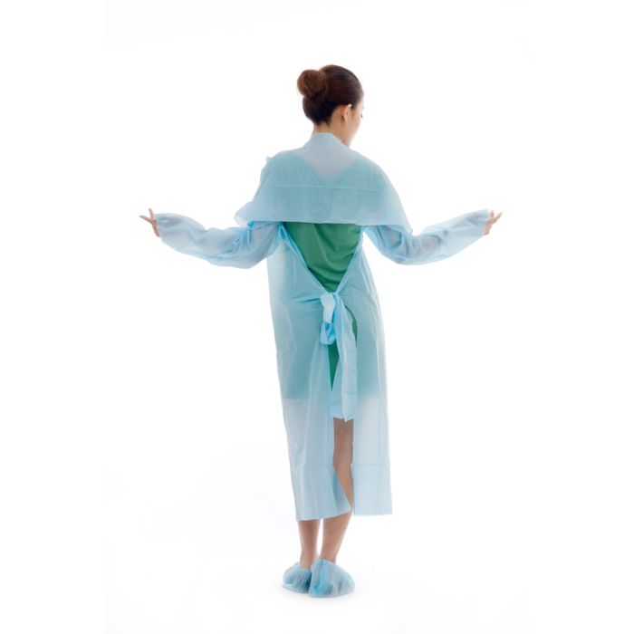 Hihallinen esiliina sinistä LDPE-muovia. Suojaesiliina on takaa avonainen, joten se on helppo pukea. Suojaesiliina solmitaan muovilenkeillä. Esiliinan hihoissa on peukalolenkit.