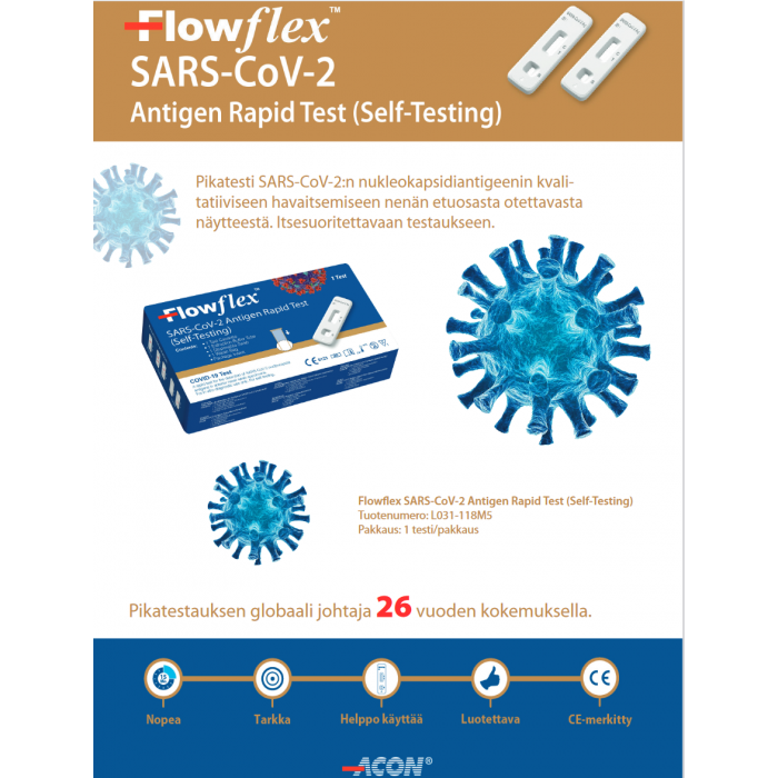 Nopea, itse tehtävä Flowflex koronatesti akuutin COVID-19-taudin toteamiseksi. Testi tehdään nenän etuosasta otettavasta näytteestä SARS-Cov-:n nukleokapsidiantigeenin havaitsemiseksi.
