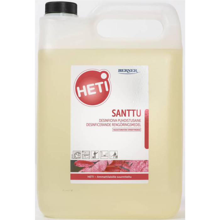 Heti Santtu+ on keittiöiden, tarjoiluvitriinien, sairaaloiden, liikunta- ja saniteettitilojen päivittäiseen puhdistukseen ja desinfiointiin.