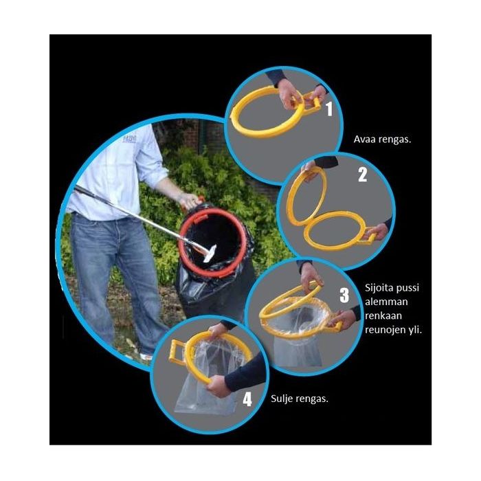 Kahvallinen jätesäkin kehyksen läpimitta on 335mm. Se on valmistettu kevyestä polypropyleenistä. Kehys avataan ja roskasäkki laitetaan kehyksen kahden renkaan väliin. Tämän jälkeen kehys suljetaan jolloin roskasäkin suu pysyy auki, ja roskien kerääminen on vaivatonta. Saatavana myös seinäteline, katso kuvat. Varastoväri musta. Muiden värien toimitusaika 1-2 viikkoa.