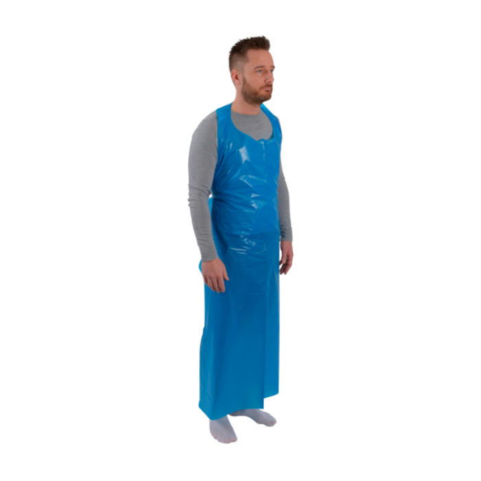 Kertakäyttöinen muoviesiliina, jossa niskalenkki ja takana vyötärönauhat, pakattu irrallaan pusseihin.