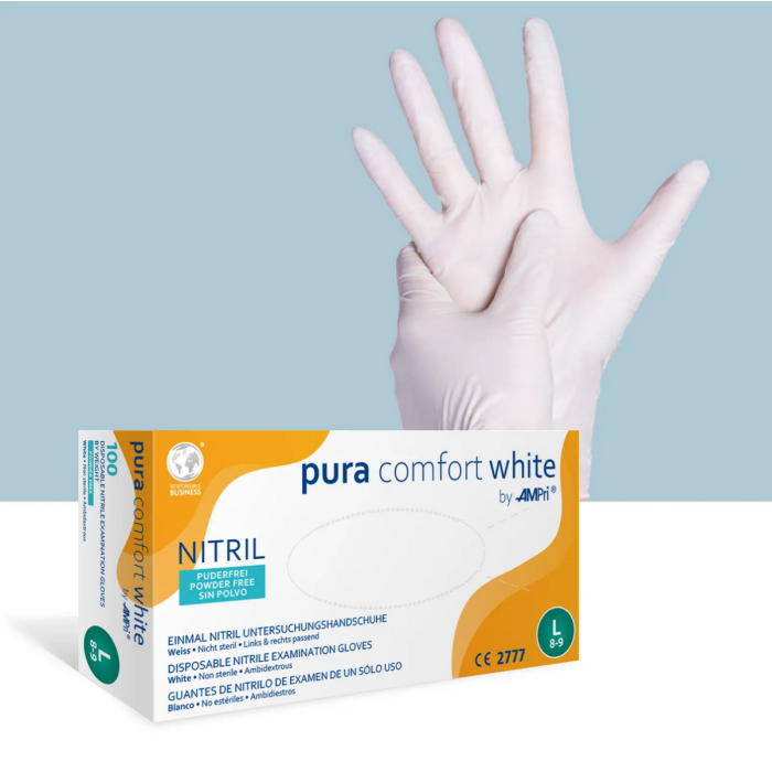 Nitriilikäsine Pura Comfort White on joustava ja tuntoherkkä tutkimuskäsine.