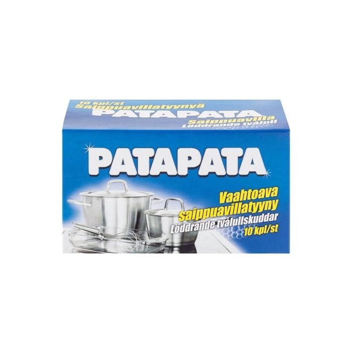 PataPata saippuavilla on jokaisen kodin tehopuhdistaja. Pakkauksessa on 10kpl vaahtoavia saippuavillalevyjä. Se tehoaa pinttyneeseen ja hankalaan likaan sekä ruosteeseen.