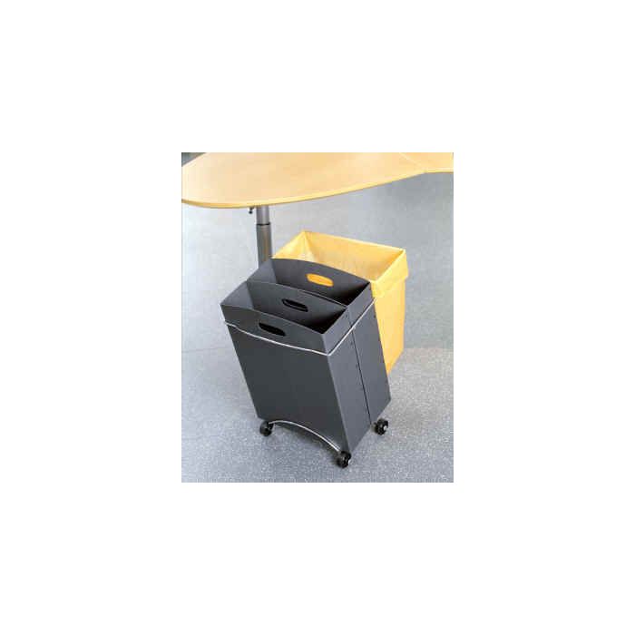 RECOR tyylikäs lajitteluvaunu toimistopaperin lajitteluun. Recor mallissa on 2 koteloa paperien lajitteluun ja pidike 30 l jätepussille esim. energiajakeelle. Lajittelija mahtuu normaalin toimistopöydän alle. Siirtelyn helpottamiseksi etureunassa on kahva sekä neljä pyörää. Kotelot sekä jätepussi ovat viistosti eteenpäin kallellaan jolloin täyttö on helppoa ja vaunua ei tarvitse käytön yhteydessä siirrellä. Runko on kromattua teräslankaa (erikoistilauksesta myös maalattuna). Vaunussa on neljä 50 mm pyörää. Kotelot ovat lujaa, pintakäsiteltyä ja kulutusta kestävää uusiopahvia. Liitossaumat ovat vahvistettu niiteillä. Väri on tyylikäs tummanharmaa.