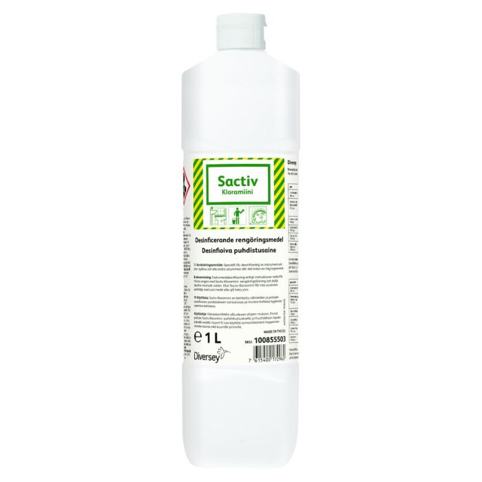 Sactiv Kloramiini on lähes hajuton, kosteitten tilojen desinfioiva puhdistusaine. Sisältää Kloramin T -klooriyhdistettä. Ei valkaisevaa vaikutusta.