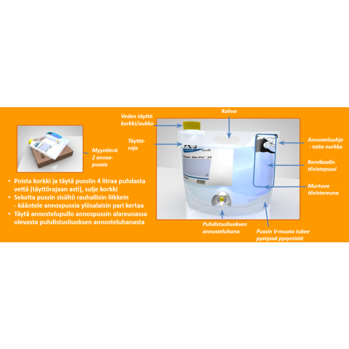 Maailman ensimmäinen annostelujärjestelmä, joka mahtuu jopa postiluukkuun! Smart Mix Pro-annostelujärjestelmä on tarkoitettu kohteisiin, joissa annostelu on ongelma, tilanpuute tai siivouskomerossa ei ole vesipistettä. Nopea ja aina oikea annostelu tuotepakkauksen ainutlaatuisen sisäänrakennetun kiinteän annostelutekniikan ansiosta. Annostelupullot löytyvät osiosta Annostelupullot ja -laitteet. Myyntierästä saadaan 16 annostelupullollista (500 ml) aina oikein annosteltua valmista käyttöliuosta. Myyntierä 2 x 63ml tai 2x 100ml annospussi.