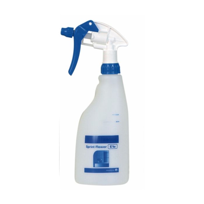 Sprint Flower -sumutinpullo (500 ml), värikoodattu, sininen, painettu tuotenimi. Käyttöalue kuvakkein.