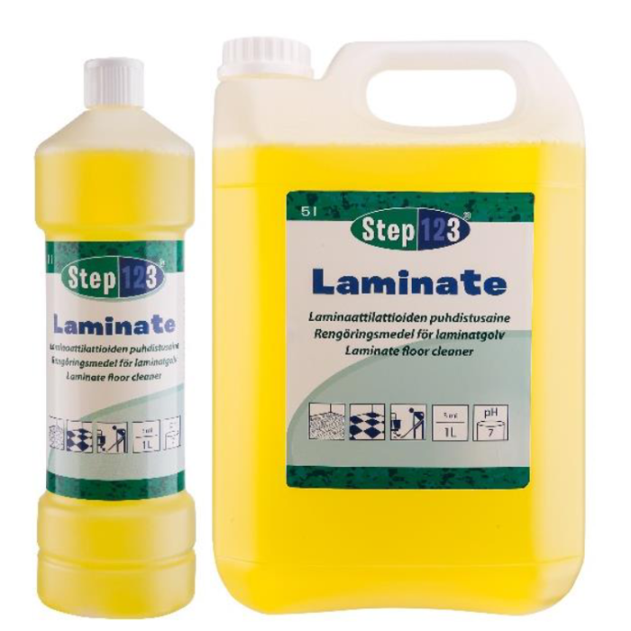 Step 3 Laminate on laminaattilattioiden puhdistusaine, joka sopii myös lakattujen ja öljyttyjen parkettien, linoleumin, klinkkeri- ja kivilattioiden sekä muovilattioiden päivittäiseen puhdistukseen. Voi käyttää vahatuilla pinnoilla.