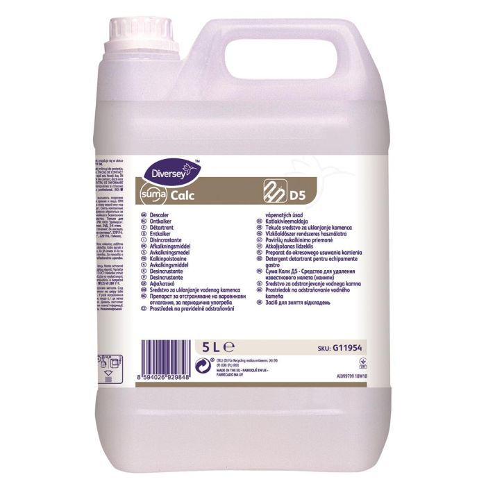 Suma Calc D5 on hapan puhdistus- ja kalkinpoistoaine, joka soveltuu keittiökoneiden ja -välineiden kalkkisaostumien poistoon sekä astianpesukoneiden puhdistukseen. Tuote soveltuu myös kaikkien happamia aineita sietävien pintojen puhdistukseen, mm. märkätiloissa.