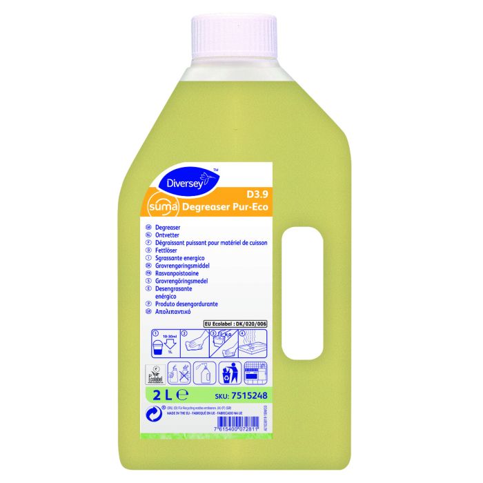 Suma Degreaser Pur-Eco D3.9 on emäksinen rasvanpoistoaine rasvan, öljyn ja karstan irrottamiseen keittiölaitteista, kuten höyrykuvuista, liesistä sekä tasoinnoilta. Soveltuu laimentamattomana myös uunien ja grillien puhdistamiseen. Suma Degreaser Pu-Eco D3.9 täyttää EU-ympäristömerkin kriteerit. Pakkaus: pullo, 2 litraa.