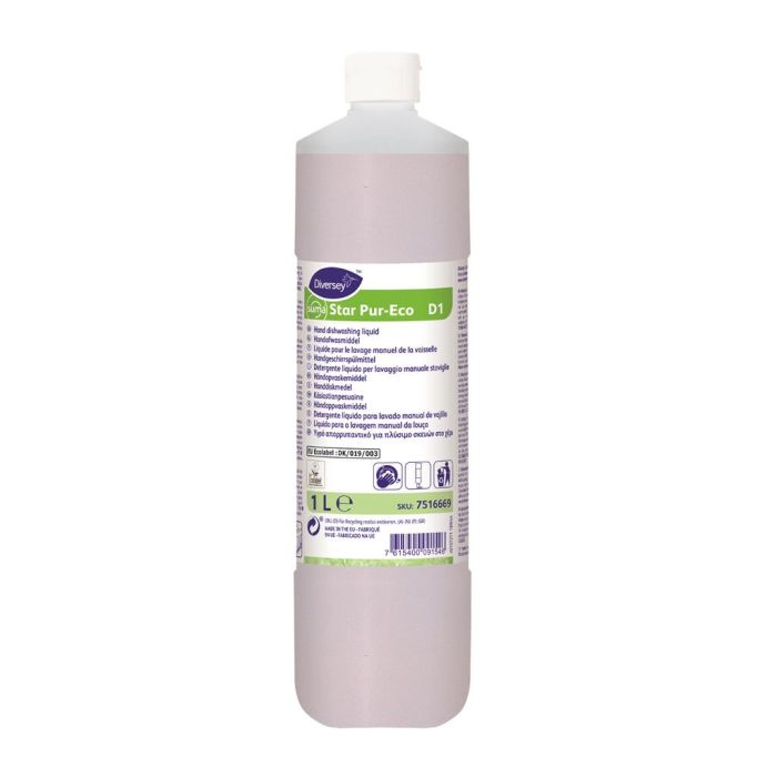 Suma Star Pur-Eco D1 on tiivistetty, neutraali astianpesu- ja yleispuhdistusaine, joka sisältää anionisia, amfoteerisiä ja ionittomia pinta-aktiivisia aineita, jotka tunkeutuvat rasvaan ja kiinni kuivuneeseen likaan. Huuhtoutuu helposti eikä jätä astioihin raitoja. Ei sisällä hajusteita tai väriaineita.
