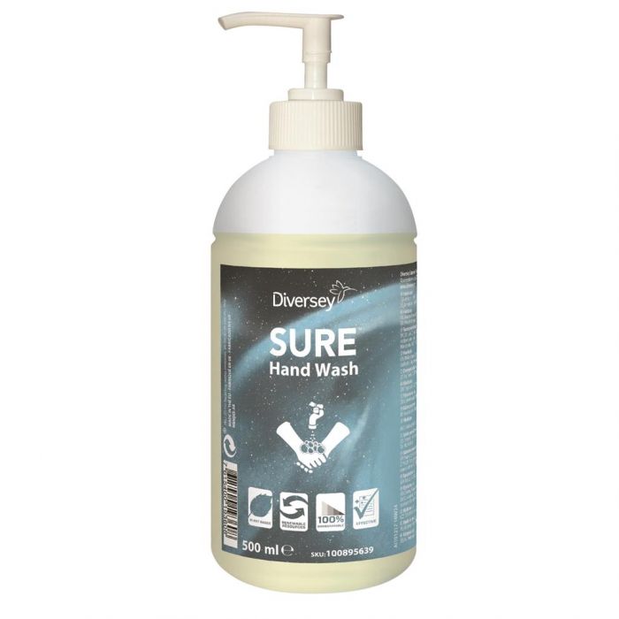 SURE Käsienpesuneste pesee hellävaraisesti kädet puhtaiksi.