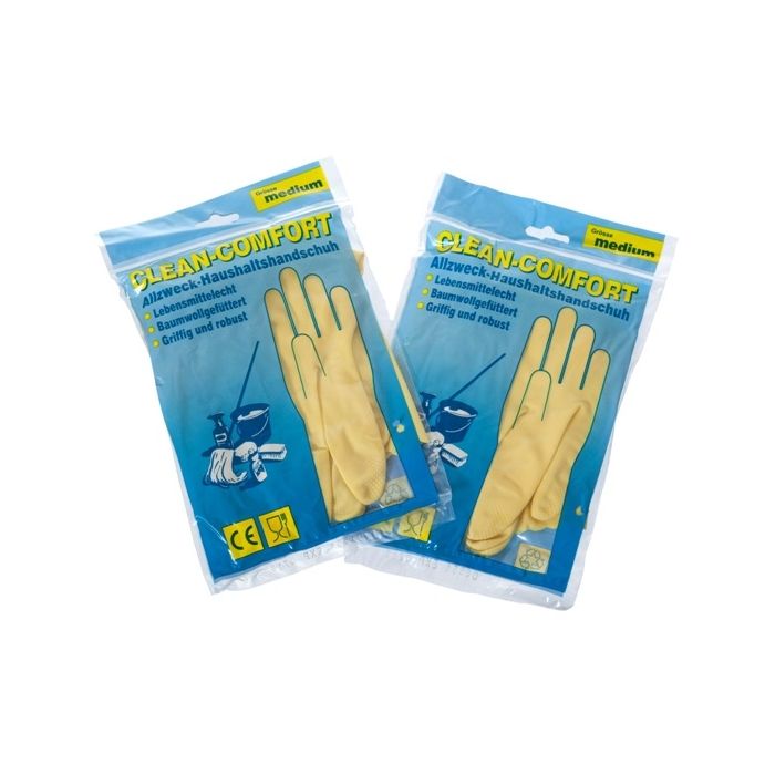 Clean Comfort talouskäsineet on valmistettu luonnonkumista ja niiden sisäpinnalla on nukattua puuvillaa. Käsineet ovat kestävät ja joustavat, mutta samalla ne ovat kuitenkin riittävän ohuet, jotta sormituntuma työhön säilyy. Käsineet kestävät hyvin erilaisia pesuaineita ja ne sopivat siivoukseen ja esim. keittiön ja puutarhatyöskentelyn yleiskäsineiksi.