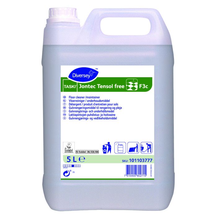 TASKI Jontec Tensol free on kiillotettava kerrostumaton lattioiden puhdistus- ja hoitoaine käsi- ja konemenetelmiin. Ei sisällä hajusteita eikä väriaineita. Soveltuu myös siivoustekstiilien kostutukseen. Voidaan annostella automaattisesti pyykinpesukoneeseen.