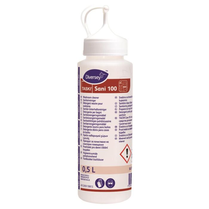 Sani 100 -annostelupullo, värikoodattu, punainen, käyttöalue kuvakkein.
