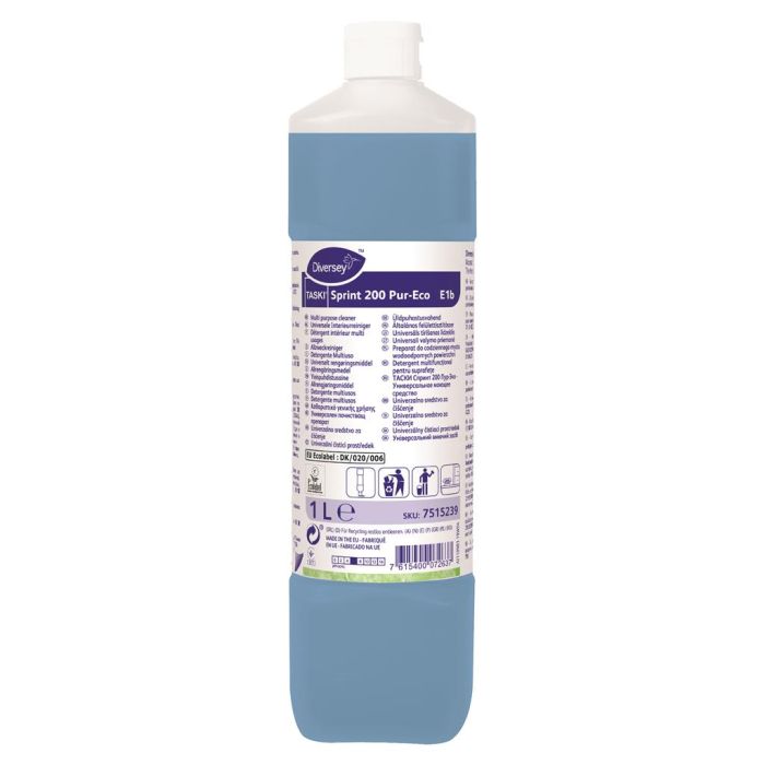 Sprint 200 Pur-Eco on hajustettu, pinnat kirkkaaksi jättävä neutraali yleispuhdistusaine kaikkien vettä sietävien kovien pintojen ylläpitosiivoukseen.