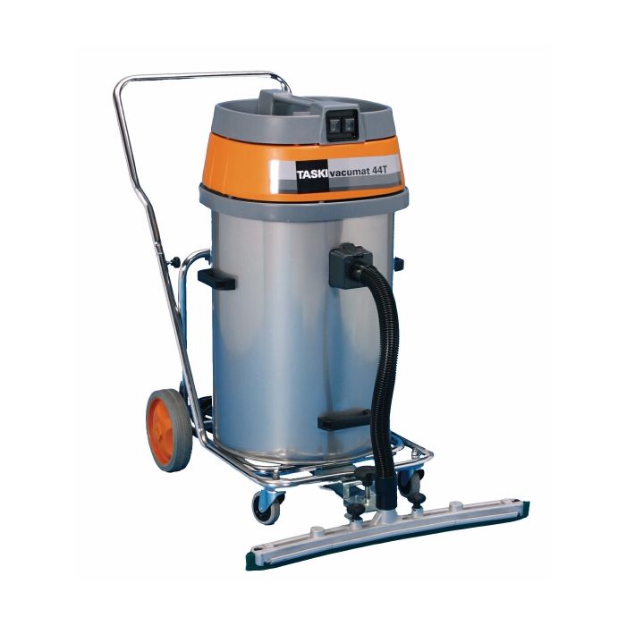 TASKI vacumat 44 T soveltuu parhaiten peruspesuihin ja suuriin kohteisiin, joissa on runsaasti imuroitavaa vettä. Vacumat 44 T imuria voidaan myös käyttää satunnaisiin pölynimurointehtäviin. Imurissa on suuri ja kestävä teräksinen 44 litran säiliö. Huolimatta suuresta täyttötilavuudestaan imuri liikkuu ketterästi kuljetusalustan suurten pyörien ansiosta. Vacumat 44 T voidaan varustaa leveällä, kiinteällä Fixomat-etusuuttimella imuroitaessa suuria pinta-aloja. Imurissa on kaksi imumoottoria, jotka takaavat riittävän imutehon kaikissa imurointitöissä. Säiliö voidaan tyhjentää kippaamalla tai nostamalla se pois kuljetusalustalta.