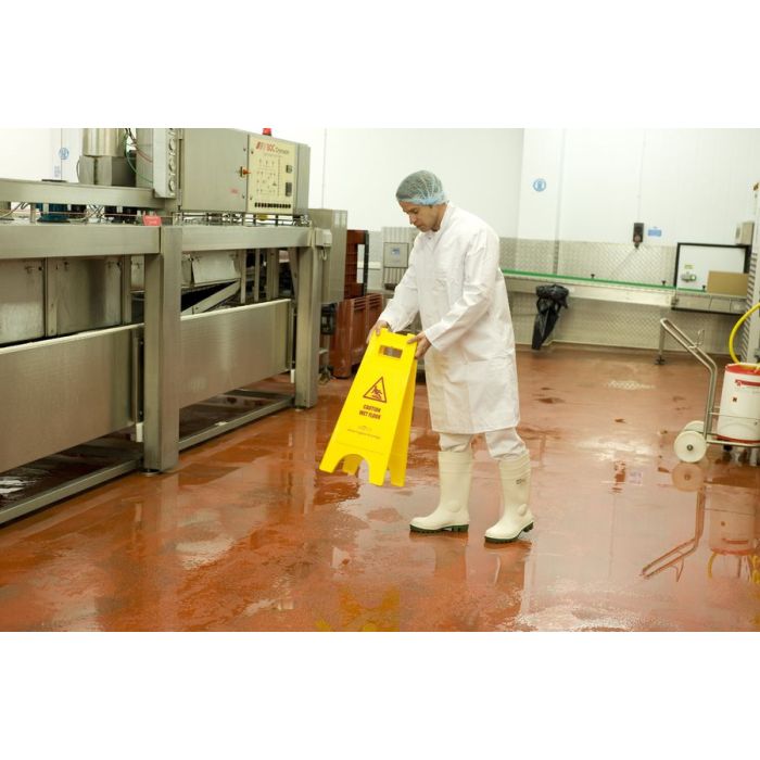 Keltainen varoituskyltti/teline. Korkeus 580 mm. Polypropyleeniä. Avattuna 450mm leveä.