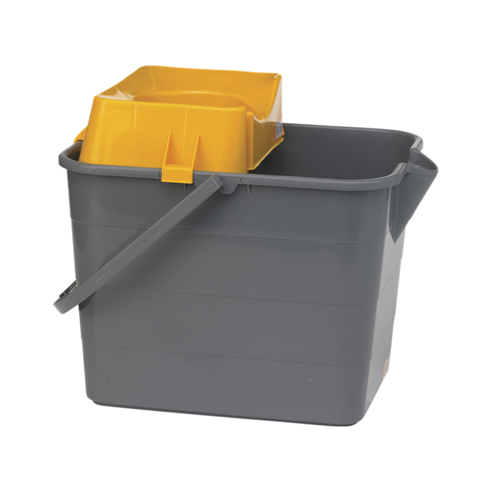 Moppisetti sisältää suorakulmaisen 15 litran sangon kantokahvalla ja kaatonokalla, moppipuristimen,