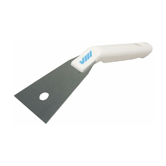 Teräksinen tasoraappa. Kiinnittyneen lian irrottamiseen tasopinnoilta, esim. keittiöissä ja leipomoissa.