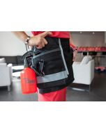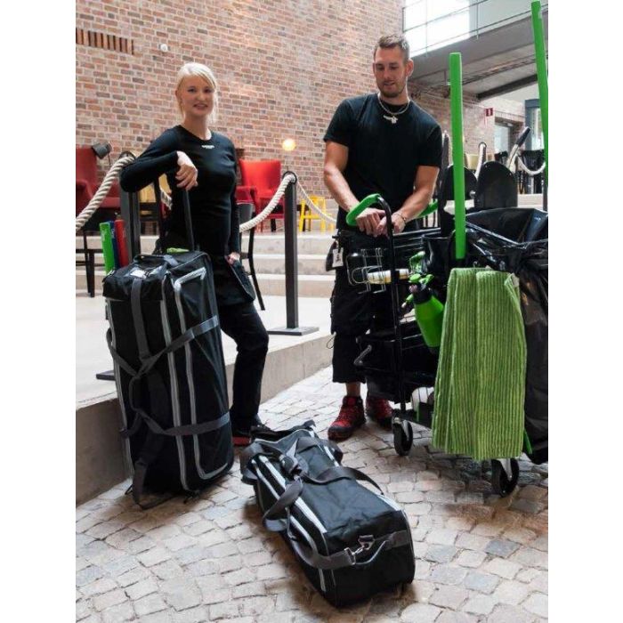 Tyylikäs ja kestävä moppi- ja tarvikelaukku helpottaa välineiden ja tarvikkeiden kuljetusta.