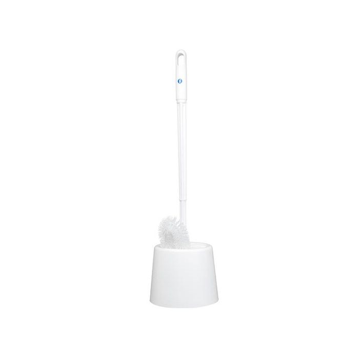 Settinä myytävä, kotimainen, kierrätysmuovista valmistettu kaulusharjallinen WC-harja ja kuppimallinen lattiateline.